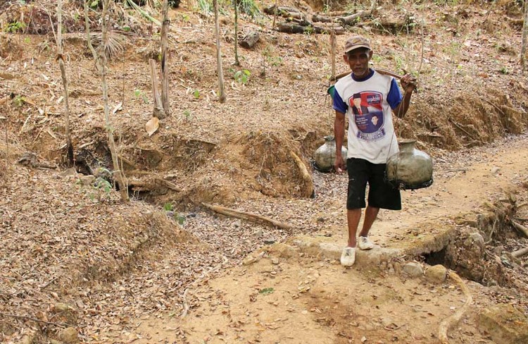 Seorang warga Dusun Pagergunung, Desa Sambong Kecamatan Pacitan memikul gentong berisi air untuk dibawa pulang kerumahnya sejauh 500 meter (19/10/2018) (Istimewa)