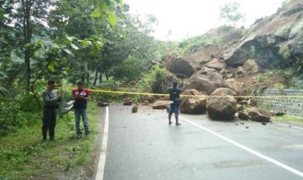 Jalur Ponorogo-Pacitan lumpuh total akibat tertutup tebing longsor di Dusun Krajan, Desa Tugurejo, Kecamatan Slahung, Kabupaten Ponorogo.