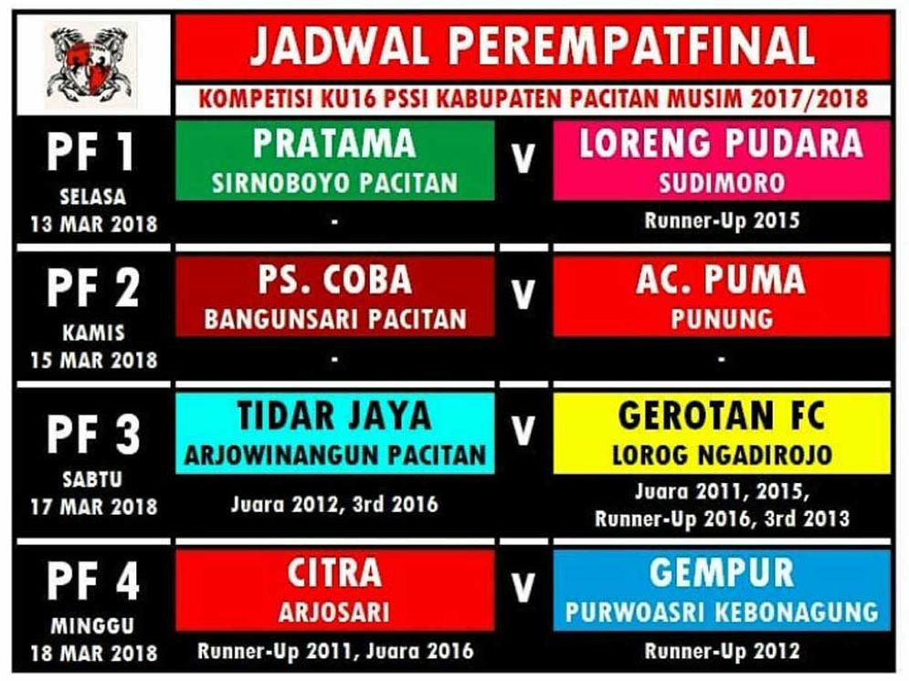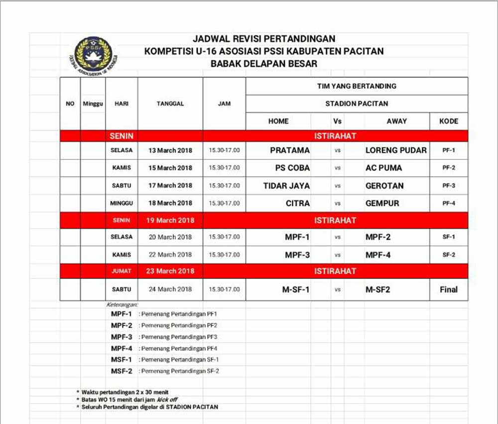 Berikut Jadwal 8 besar KU-16 Askab Pacitan 2018 :