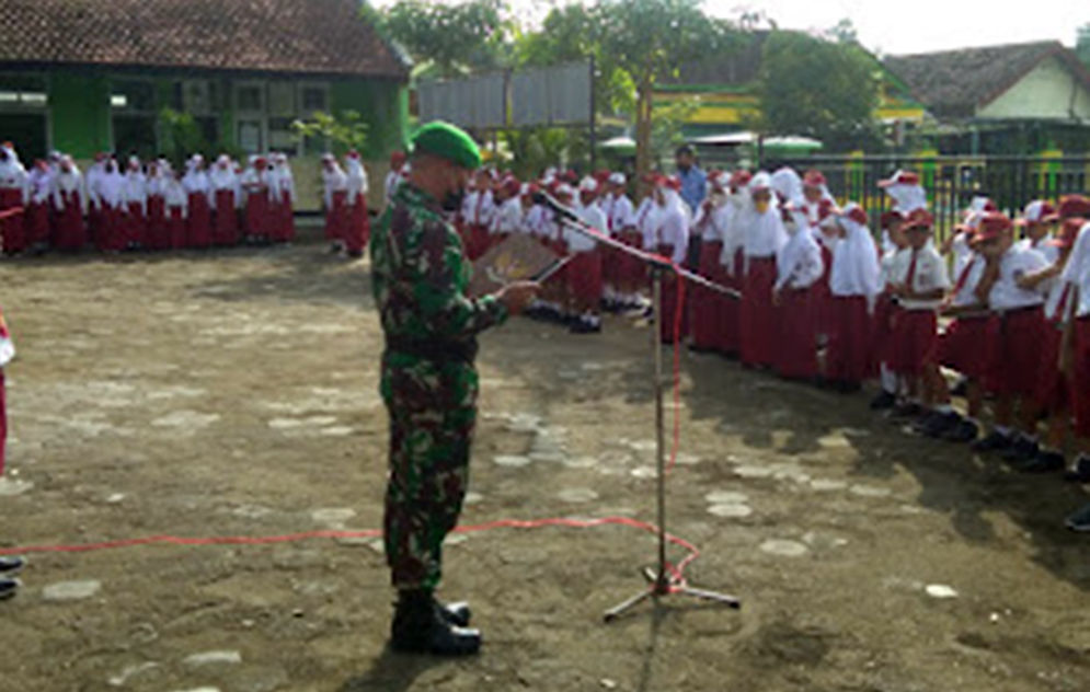 PACITAN – Hari pertama masuk sekolah dimanfakan oleh personel Babinsa Pacitan untuk menanamkan rasa cinta tanah air.
