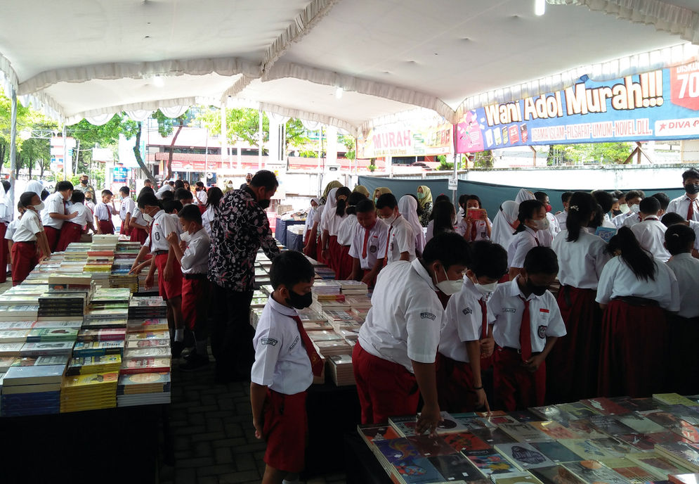 Pada pembukaan yang berlangsung Senin (14/2/2022) para siswa dari sejumlah sekolah dasar juga ikut hadir.Mereka tampak antusias melihat buku yang dipamerkan dan dijual/