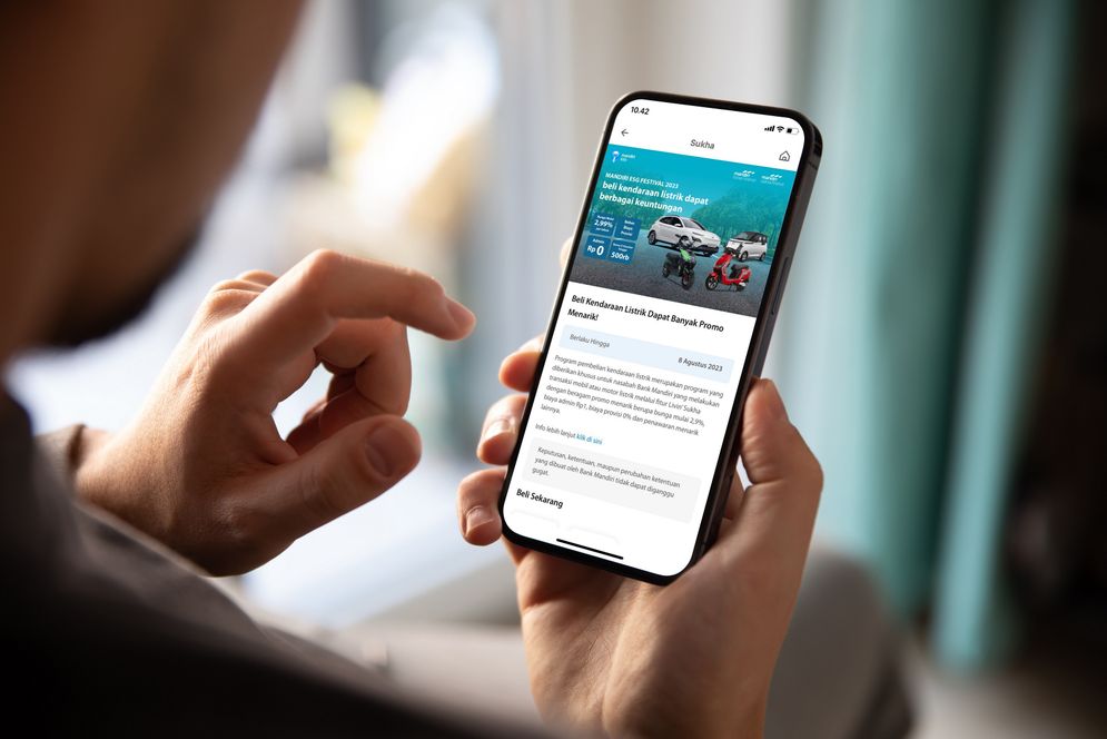Pada program ini, nasabah Bank Mandiri bisa mendapatkan berbagai promo menarik saat membeli mobil maupun motor listrik melalui fitur Livin’ Sukha pada aplikasi Livin’ by Mandiri dan Kopra by Mandiri. Promo berlaku untuk pembelian mobil listrik merek Wuling, BMW dan Lexus, serta untuk motor listrik merek Gesits dan Volta.