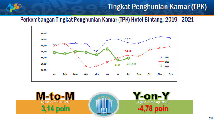 Sementatra itu, Tingkat Penghunian Kamar (TPK) hotel klasifikasi bintang di bulan Agutus 2021 mencapai rata-rata 29,39 persen atau mengalami peningkatan sebesar 3,14 poin dibandingkan bulan sebelumnya.