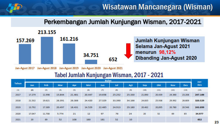 Bulan Agustus 2021, Kunjungan Wisman Turun 58,33% Dibandingkan Tahun Lalu
