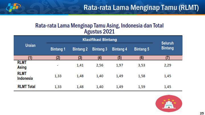 "Rata-rata lama menginap tamu (RLMT) asing pada hotel klasifikasi bintang selama bulan Agustus 2021 tercatat rata-rata sebesar 2,29 hari atau terjadi kenaikan sebesar 0,17 poin jika dibandingkan dengan keadaan Juli 2021 yang mencapai 2,12 hari."paparnya.