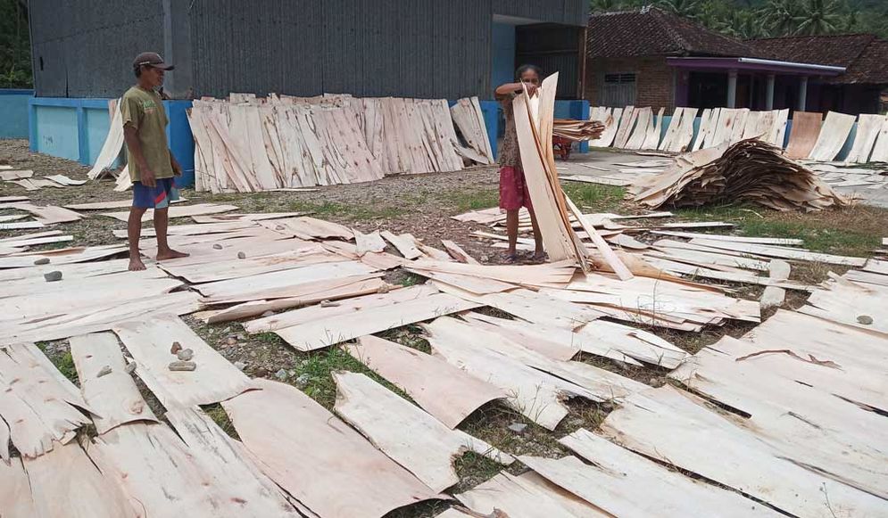 Halopacitan,Arjosari—Teriknya sinar matahari tidak membuat Suyadi dan istrinya berhenti mengumpulkan jemuran lembaran-lembaran kayu tipis yang telah kering dan menggantinya dengan yang masih basah.