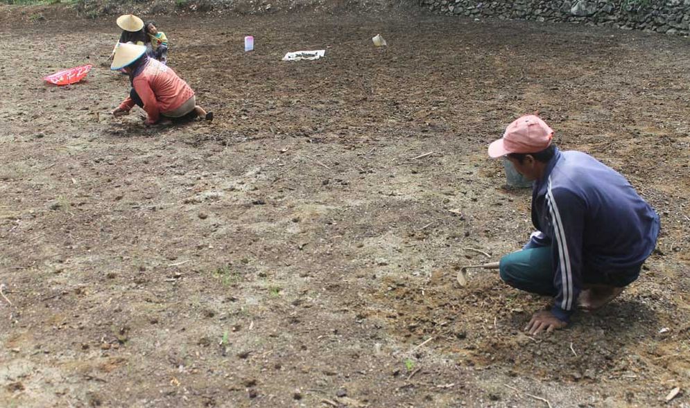 "Seharusnya saat ini areal persawahan sudah digenangi air dan siap untuk ditanami mengingat usia benih sudah di atas 14 hari, tetapi mau bagaimana lagi hujan tiba-tiba berhenti dan debit sungai masih kecil" ungkap Asrori, salah satu petani penggarap Rabu (02/01/2019).