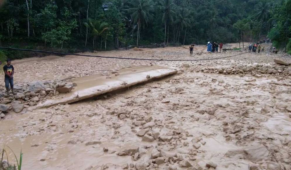Kendati posisi jalan masih lebih tinggi sekitar 1 meter, peningkatan debit air menyebabkan permukaan sungai meluber hingga masuk kawasan pemukiman dan memutus jalan raya.
