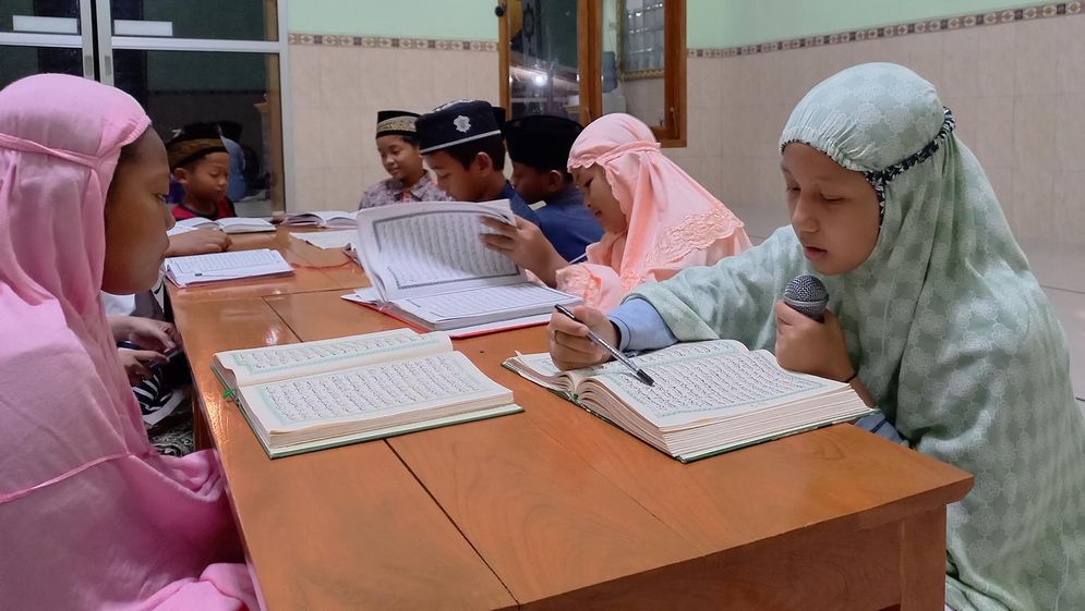 Anak-anak dan remaja terlihat khusyuk membaca Al-Quran, satu membaca dan satu menyemak bersama-sama.