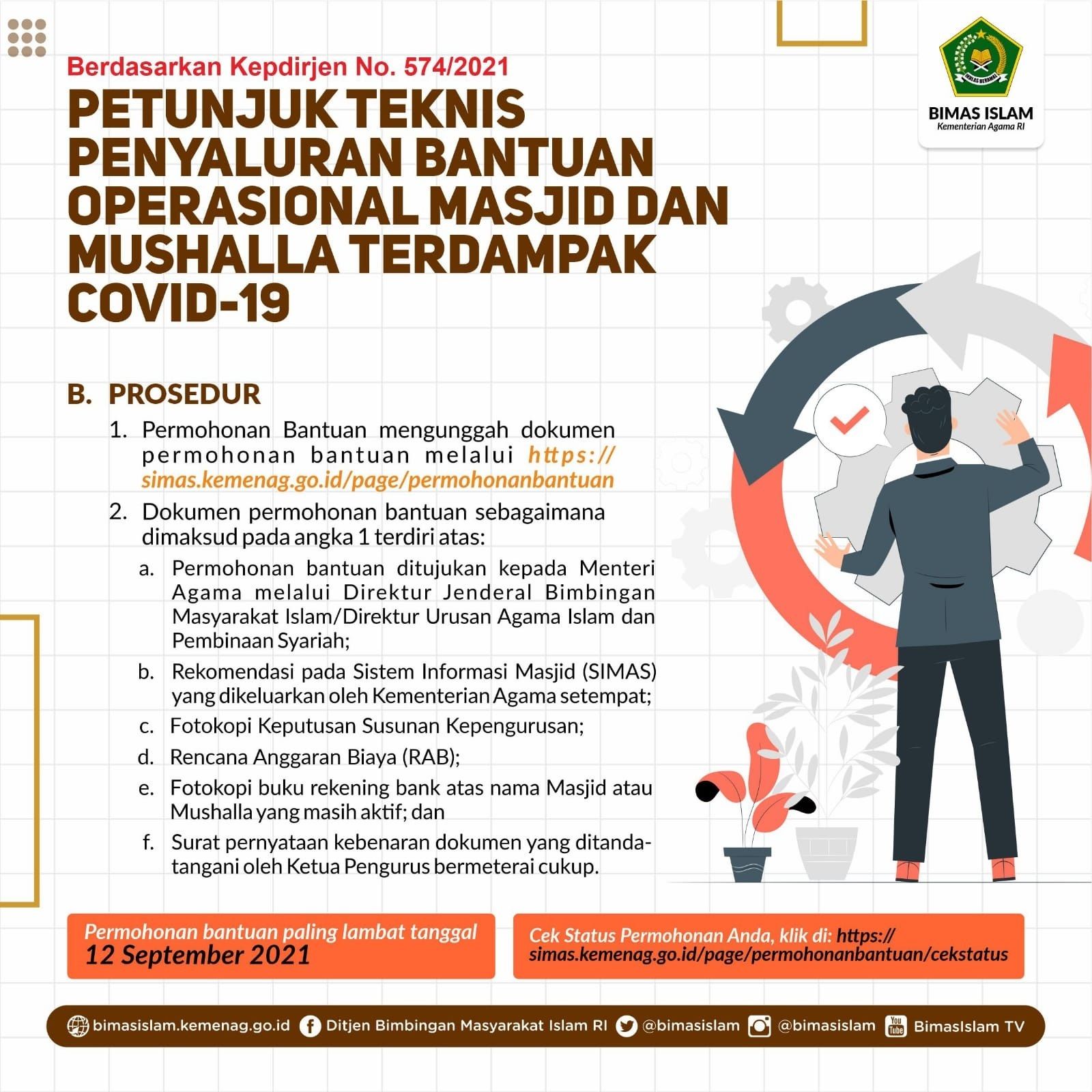 Adapun dokumen permohonan bantuan ditujukan kepada Menteri Agama melalui Dirjen Bimas Islam/Direktur Urais Binsyar. Dokumen tersebut selanjutnya diunggah pemohon ke laman https://simas.kemenag.go.id/page/permohonanbantuan.