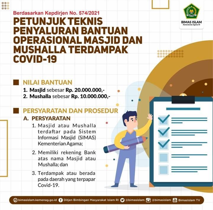 Sementara itu, Kepala Subdirektorat Kemasjidan Direktorat Urusan Agama Islam dan Pembinaan Syariah Abdul Syukur menjelaskan, salah satu persyaratannya, masjid/musala harus terdaftar pada Sistem Informasi Masjid (SIMAS) Kementerian Agama, memiliki rekening Bank atas nama masjid/musala, dan terdampak/berada pada daerah yang terpapar Covid-19.