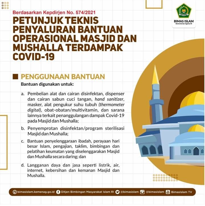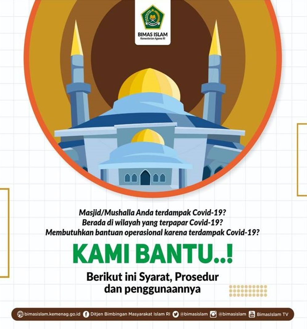 Sebagai bentuk dukungan dan kehadiran pemerintah kepada takmir dan pengurus masjid/musala dalam penanganan pandemi covid-19, Kementerian Agama (Kemenag) melalui Direktorat Jenderal Bimbingan Masyarakat Islam (Ditjen Bimas Islam) akan menyalurkan bantuan operasional masjid dan musala di daerah terdampak covid-19 tahun anggaran 2021.