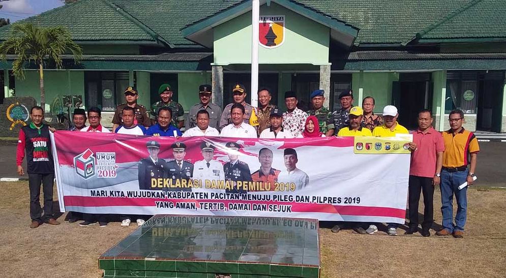 Halopacitan, Pacitan—Kesepakatan itu tertuang dalam deklarasi damai yang digelar di halaman Makodim 0801 Pacitan, Jumat, (28/09/2018) dan diikuti para konstan pemilu.