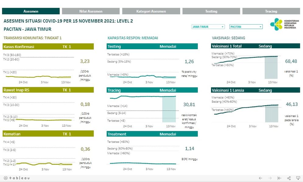 Seperti dikutip dari vaksin.kemkes.go.id, asesmen situasi covid 19 Kabupaten Pacitan, per 15 Nopember 2021 vaksinasi di Pacitan masuk kategori sedang dengan total vaksinasi 68,48 dan vaksinasi 1 lansia sebesar 46,13.