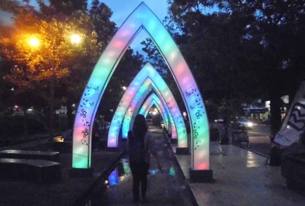 Setelah mahrib usai, orang-orang kembali berdatangan ke alun-alun. Menikmati keindahan warna-warni lampu taman yang menghiasi wilayah tersebut. Di banyak sudut, terlihat muda-mudi asyik berswa foto atau selfie. Ah, alun-alun Pacitan memang ngangeni. (Muhamad Arief Wicaksono)