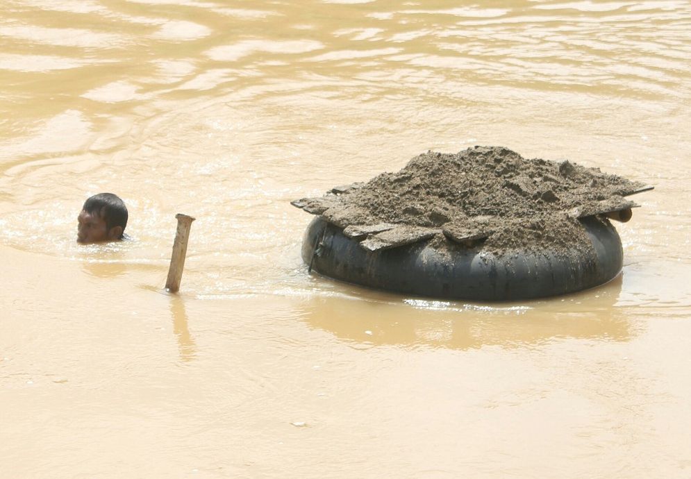 Menyelam bukan akhir dari kerja. Setelah pasir terkumpul kemudian para penambang pasir memangul pasir itu dengan keranjang ke dalam mobil yang lokasinya cukup jauh dari tepi sungai. “Harus menaikan ke bak mobil, jalan sekitar 30 meteran. Beratnya sekitar 40 kilo,” kata Santoso, penambang pasir yang lain.