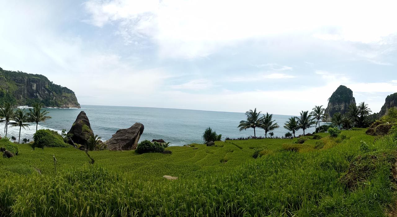 PACITAN-Pesona alami Pantai Pangasan bersanding serasi dengan persawahan warga. Deburan suara ombak pantai dan gemercik aliran irigasi sawah saling bersautan. Sebuah pertunjukkan alam yang sulit untuk diabaikan.