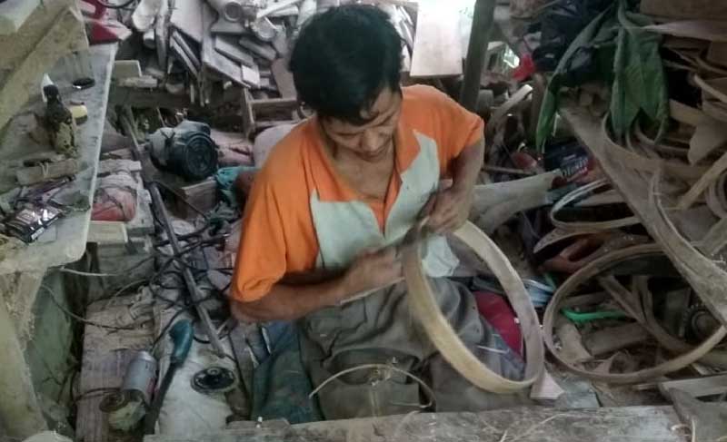 Halopacitan, Tulakan—Tangan Tumardi bergerak tangkas menggarap bambu yang dia pegang. Dibentuknya sebuah lingkaran dari bilah bambu yang telah dia haluskan. Beberapa kali dia memandang hasil karyanya untuk memastikan lingkaran yang terbentuk sudah benar-benar sempurna.