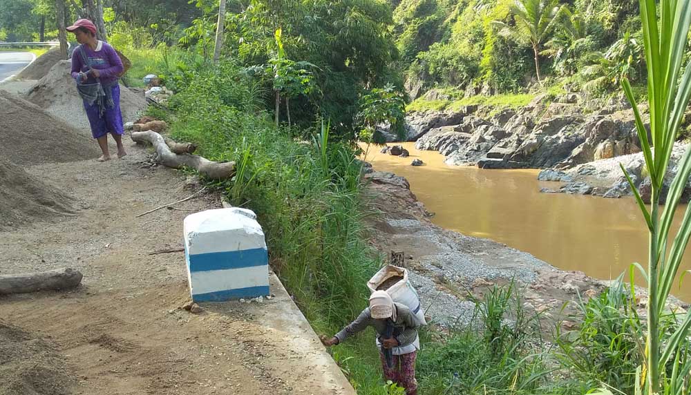Di tengah terik yang membuat peluh kian bercucuran, mereka kemudian menggendong keranjang penuh pasir dari sungai tersebut ke pinggir jalan yang ada di dekat sungai.