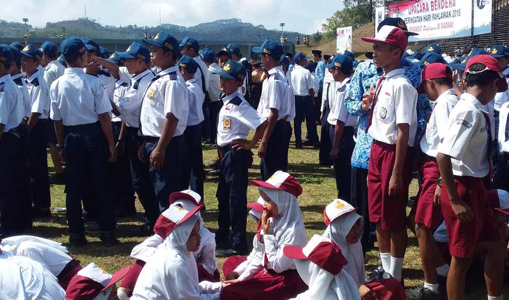 Rafael berdiri tegap mengikuti upacara Hari Pahlawan meski teman-temannya memilih duduk karena lelah (Halopacitan/Sigit Dedy Wijaya)