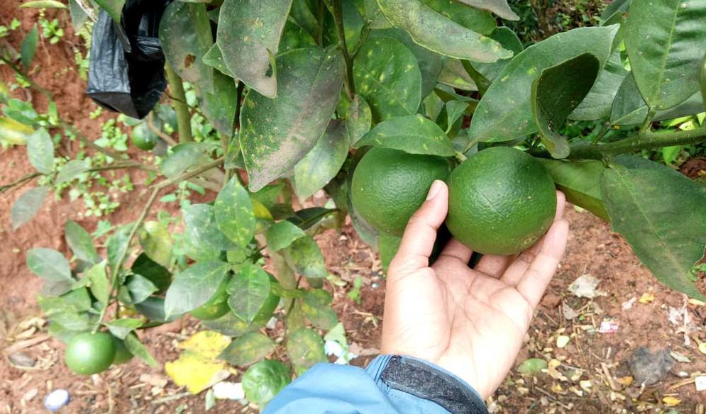Sukijan menanam bibit jeruk bantuan pemerintah itu di sekitar rumahnya. Buahnya tampak bergelayut menunggu masak.