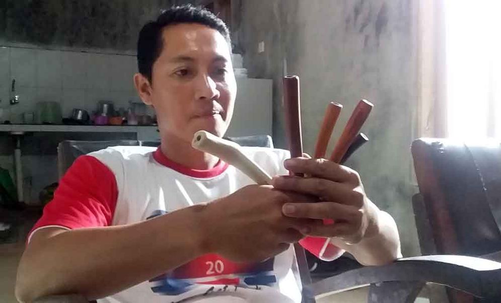 "Soalnya kalau menggunakan mesin tidak akan bisa sempurna, harus manual untuk membentuk pipanya, setelah dilubangi kemudian dibentuk menggunakan amplas kasar hingga permukaan halus, finisingnya di oles lem kemudian diamplas lagi sampai mengkilat dan halus," terangnya.