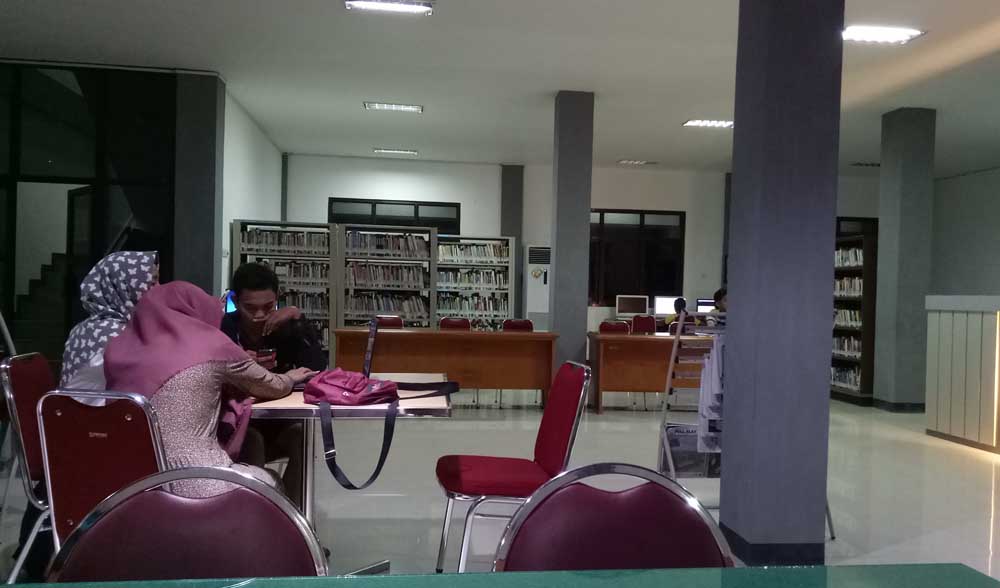 Hari mulai gelap dan hujan masih enggan berhenti, namun Perpustakaan Kabupaten Pacitan di malam hari tetap saja ramai pengunjung. Beberapa pengunjung berkelompok di beberapa titik. Entah sekadar berselancar dengan internet gratis, hingga mengerjakan tugas sekolah.