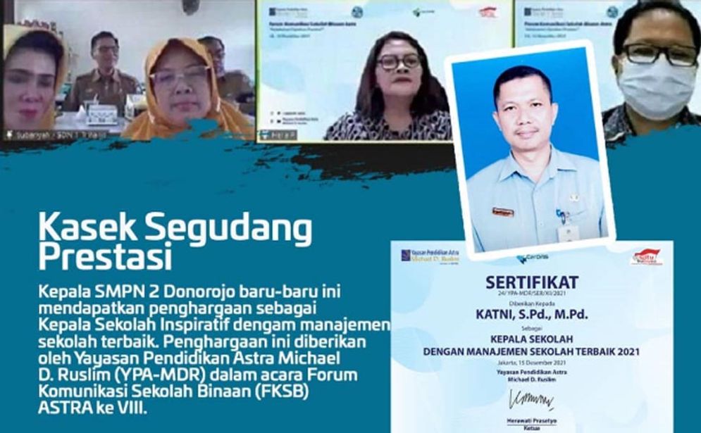PACITAN-Dua jempol untuk. Kepala SMPN 2 Donorojo tersebut baru-baru ini mendapatkan penghargaan sebagai Kepala Sekolah Inspiratif dengam manajemen sekolah terbaik. Penghargaan diberikan oleh Yayasan Pendidikan Astra Michael D. Ruslim (YPA-MDR) dalam acara Forum Komunikasi Sekolah Binaan (FKSB) ASTRA ke VIII.