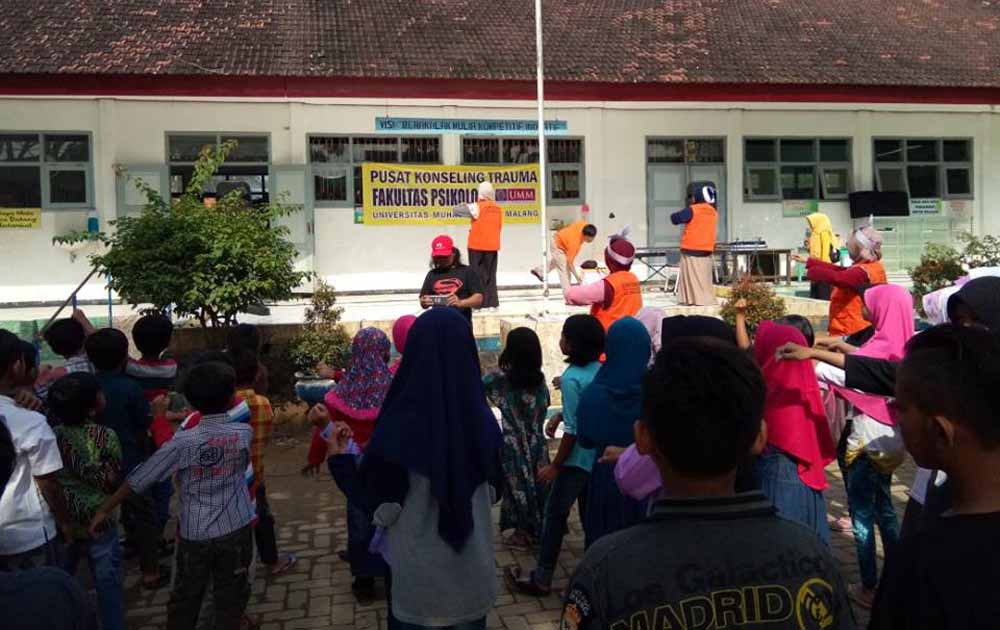 Meski cuaca cukup panas, anak-anak tampak semangat mengikuti acara yang digelar Jumat (29/12/2017). “Semangat menjadi modal penting untuk bisa menghilangkan trauma,” kata Wahyu Wurypriyanto, mahasiswa Fakultas Psikologi UMM yang menjadi salah satu pembimbing program tersebut.