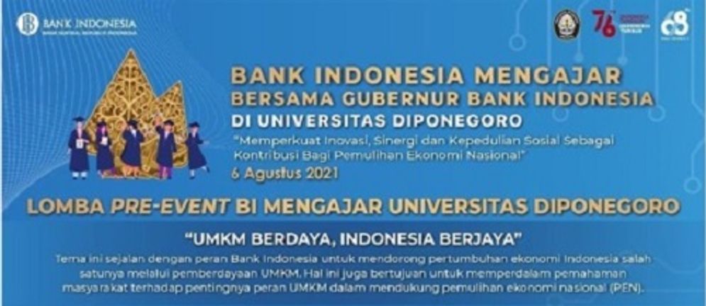 Universitas Diponegoro (Undip) berkolaborasi Bank Indonesia mengundang mahasiswa untuk bergabung dalam acara kuliah umum “BI Mengajar” pada 06 Agustus 2021 mendatang. Tidak hanya itu, Undip juga mengajak semua mahasiswanya untuk berkontribusi dengan mengikuti lomba Pre-Event dalam rangka membangkitkan kembali UMKM.