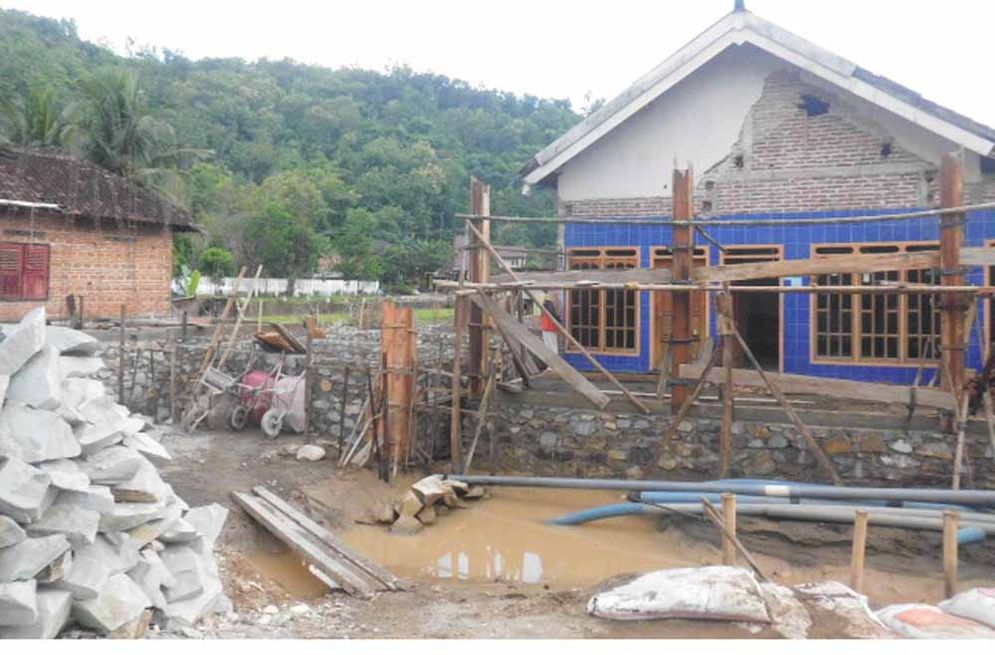 Tahap awal pembangunan rumah dimulai pada tgl 20 Desember 2017 dibantu warga dan anggota TNI. Pembangunan rumah benar-benar dimulai dari awal dengan membuat pondasi baru hingga tidak bisa selesai dengan cepat. “Pondasi rumah ambles terbawa arus deras banjir,’’ kata Heru, pemilik rumah yang rusak Rabu (03/01/2018).