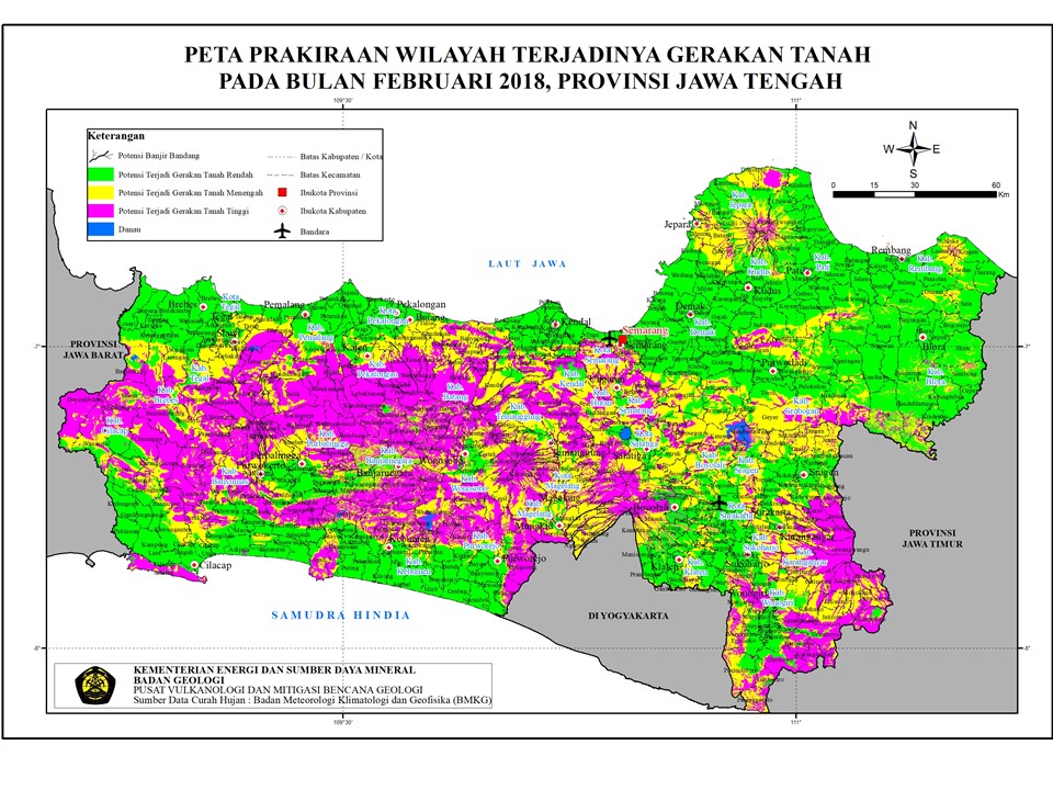 Dari peta potensi longsor pada Februari 2018, wilayah Jawa Barat, Jawa Tengah dan Jawa Timur adalah daerah yang memiliki potensi paling banyak dari ancaman longsor.