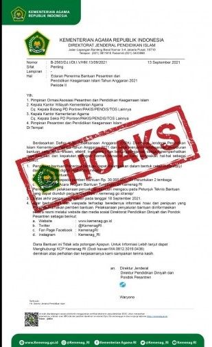 Masyarakat harus semakin hati-hati menyikapi sebuah informasi. Banyak informasi masuk kategori hoaks yang menyesatkan. Seperti baru-baru ini, munculnya surat tentang Edaran Penerima Bantuan Pesantren dan Pendidikan Keagamaan Islam Tahun Anggaran 2021 Periode II. Direktur PD Pontren Waryono memastikan bahwa surat Direktur Pendidikan Diniyah dan Pondok Pesantren (PD Pontren) No B-2563/DJ.I/Dt.I.V/HM.13/09/2021 tertanggal 13 September 2021 itu termasuk kategori tidak benar alias hoaks.